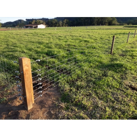Esse modelo de cerca para ovelhas e carneiros não precisa de arames para sua instalação, sendo utilizados apenas os arames da tela para tensionar e instalar.