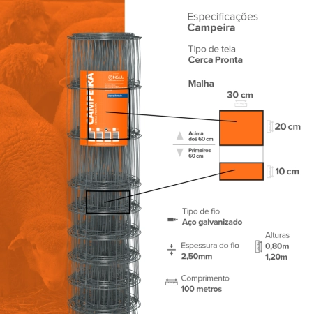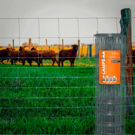 O diferencial da tela Campeira Insul, indicada para cercamento de ovinos, está na malha progressiva, com aberturas menores na base e maiores no topo, e fios mais espessos nas bordas, agregando mais firmeza e estabilidade à estrutura.